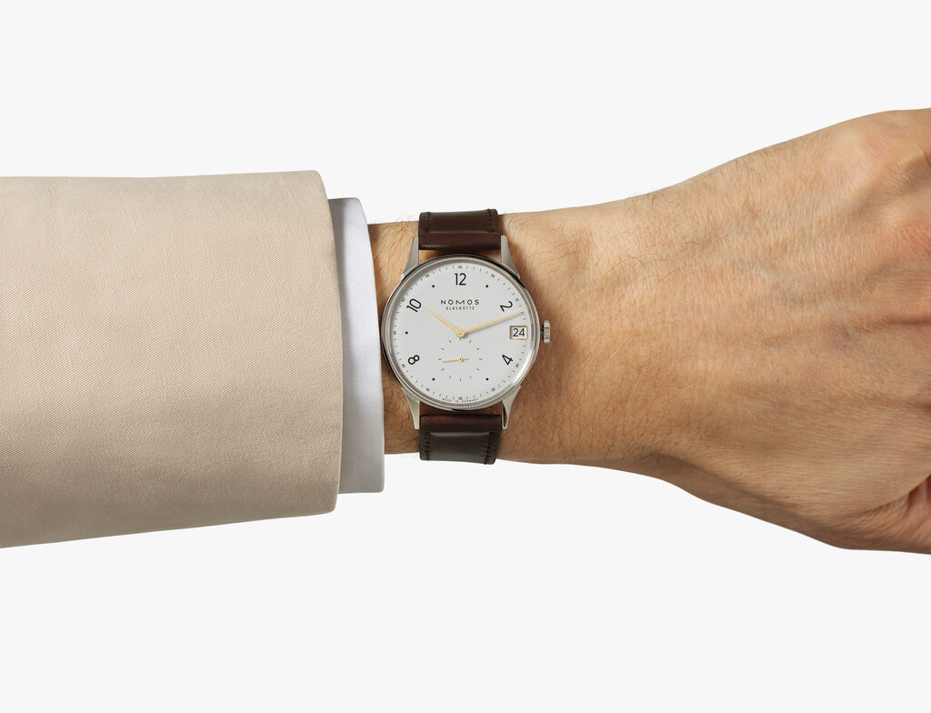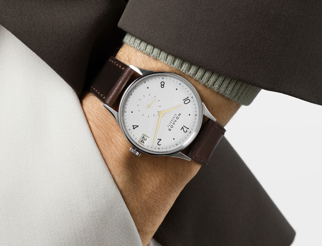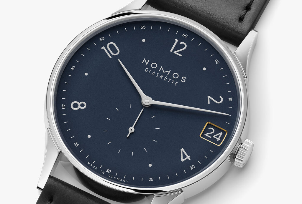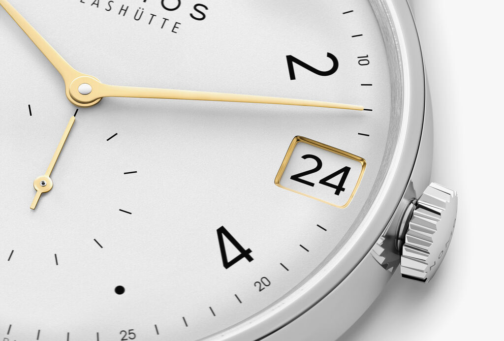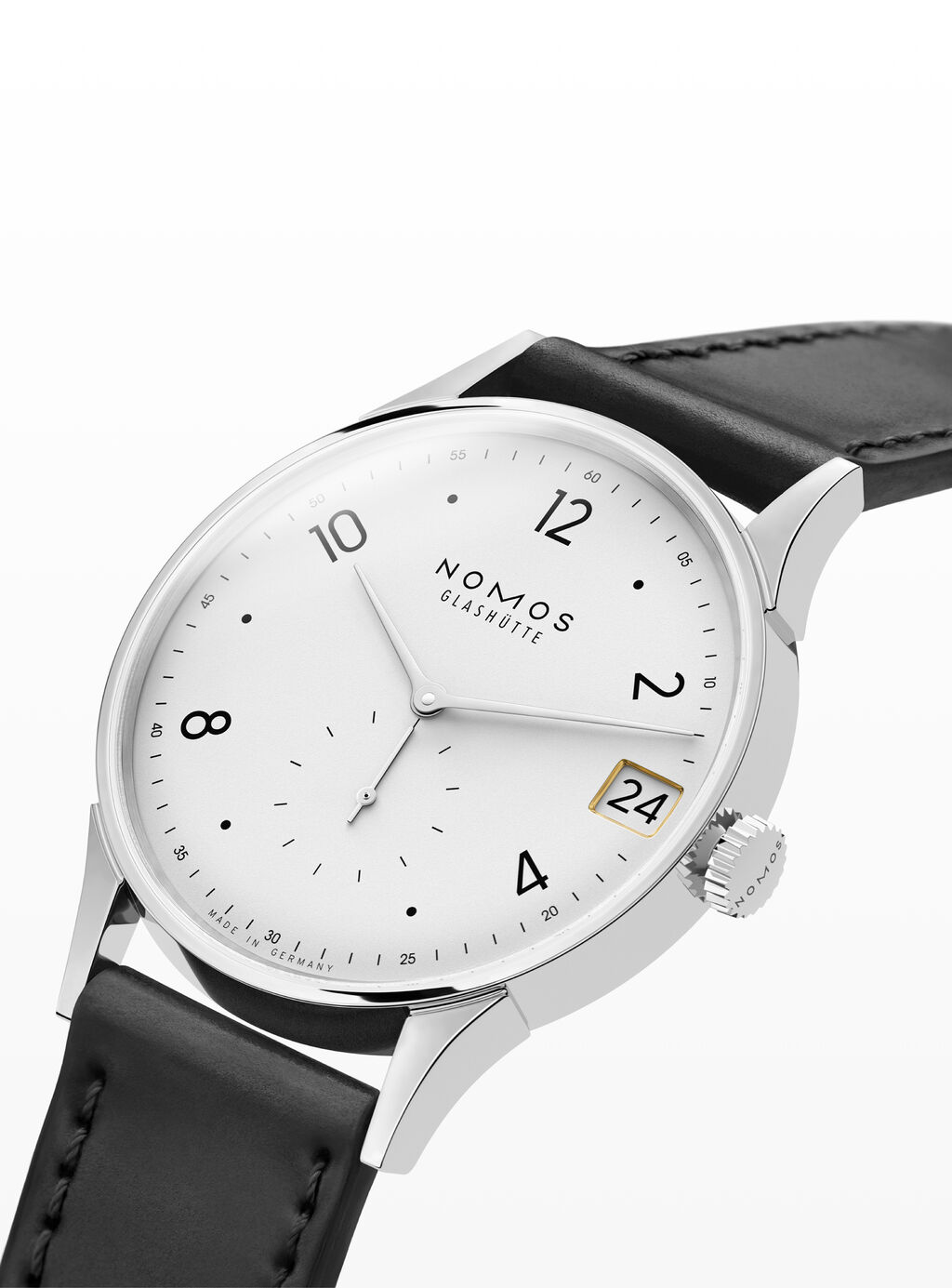 The clear typography used for the hour numerals is distinctly modern, while the date window is located at 3'clock—a classic position that is rarely found in watches from NOMOS Glashütte.