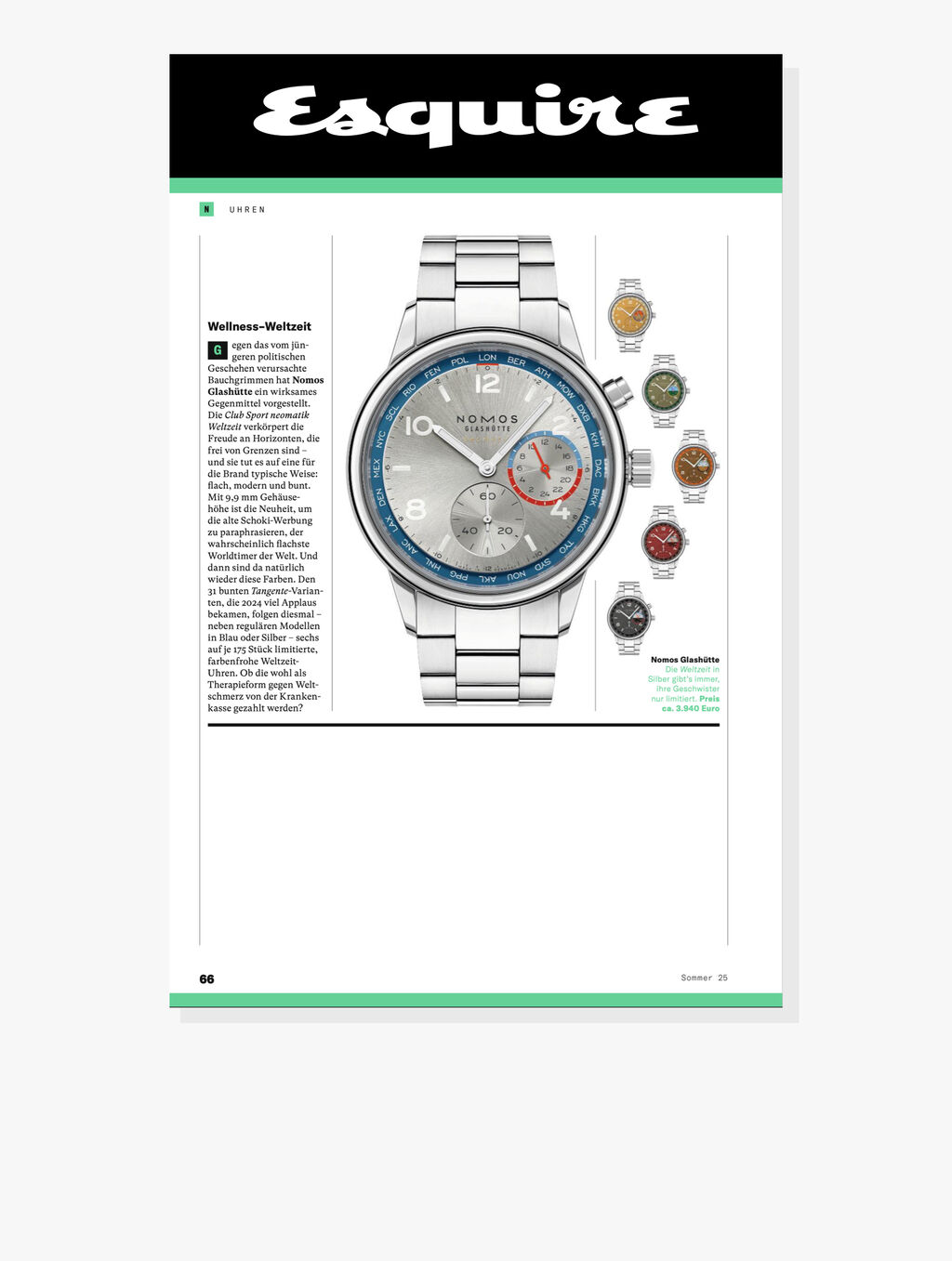 Im aktuellen Heft lobt Esquire den „wahrscheinlich flachsten Worldtimer der Welt” und bescheinigt den farbenfrohen Uhren von NOMOS Glashütte echte Wohlfühlqualitäten. Online ist das Stück hier zu lesen.