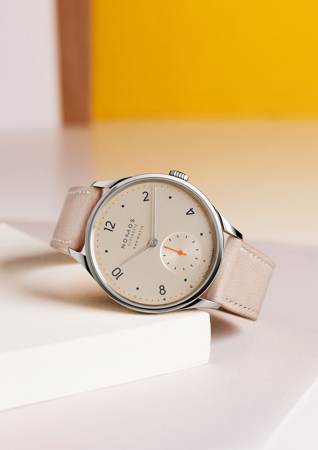 Nur 3,2 Millimeter hoch ist NOMOS-Automatikkaliber DUW 3001. Entsprechend schlank liegt auch Minimatik am Handgelenk: Diese Uhr ist bestens proportioniert und sieht immer nach guter Laune aus. Hier: in Champagner.