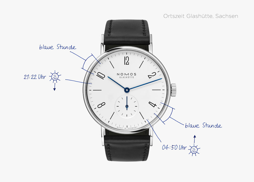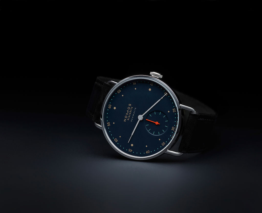 Keine weiße Nacht für Modell Metro: Passend zum nachtblauen Zifferblatt ist es beim NOMOS-Bestseller schon stockdunkel.