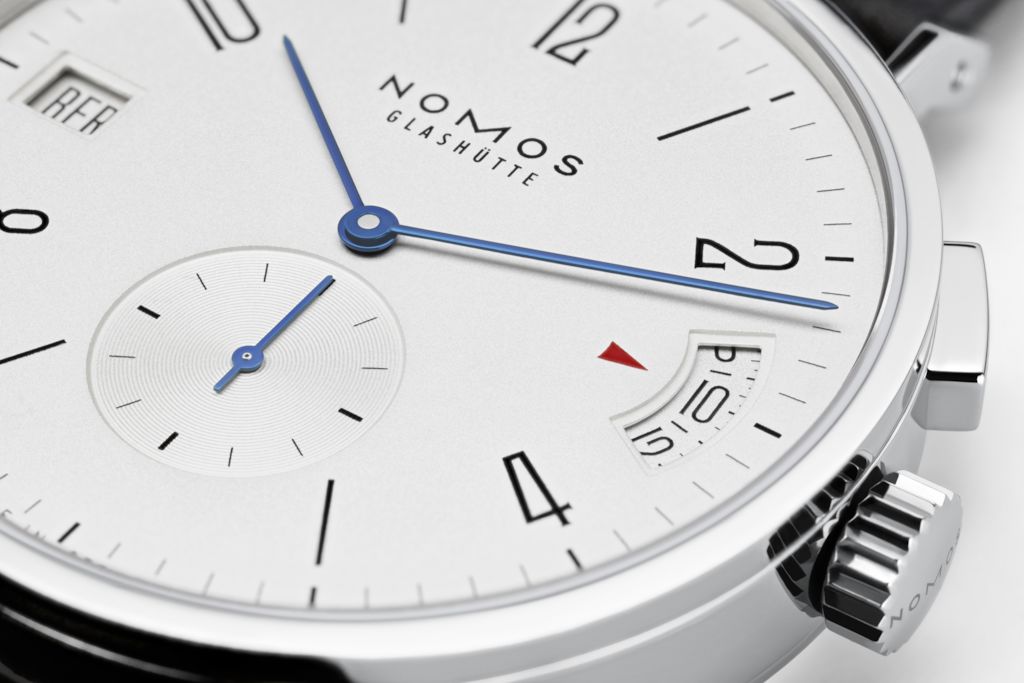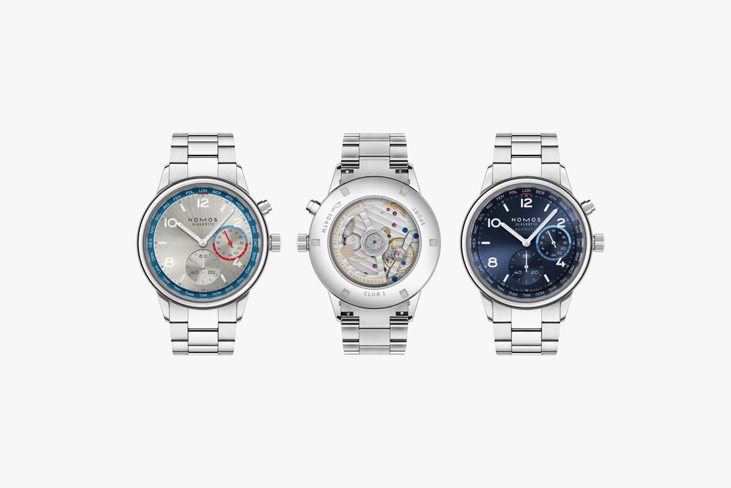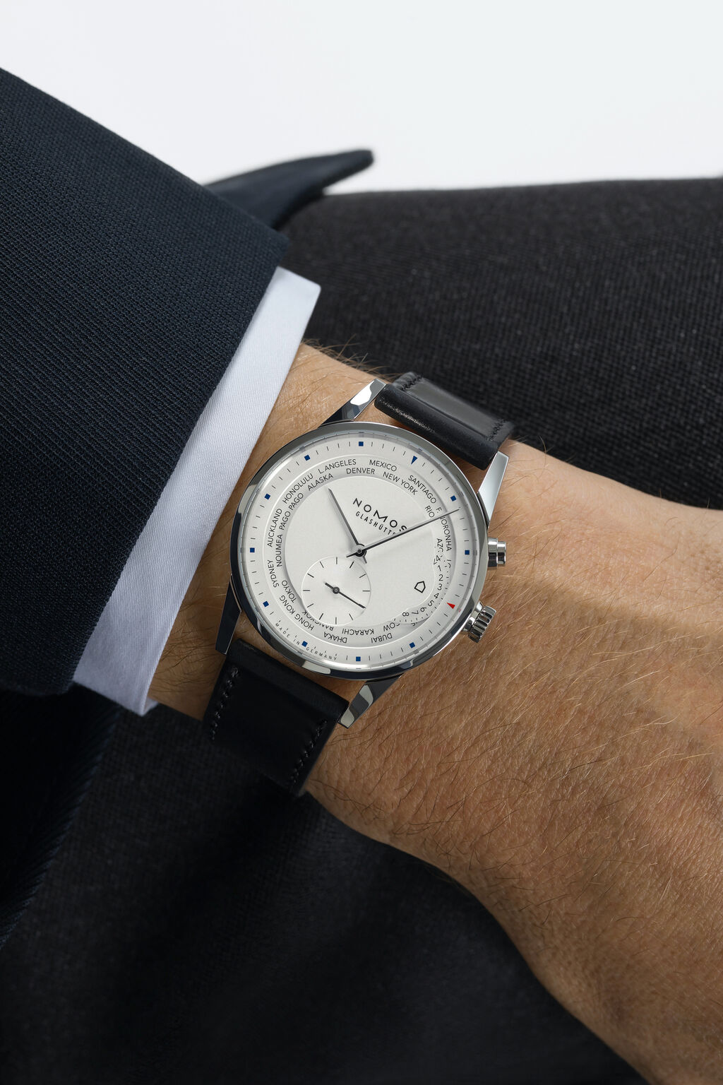 In der Automatikuhr Tangomat GMT von NOMOS Glashütte wird der Weltzeitmechanismus als flexible zweite Zeitzone ausgespielt: Die 24-Stunden-Anzeige ist mit der Uhrzeit eines Ortes synchronisiert, dessen Tagesverlauf man im Blick behalten möchte. Die Zeiger des großen Zifferblatts geben währenddessen Stunde und Minute der aktuellen Zeitzone an – erkennbar an der Stadt, deren Kürzel in einem Fenster auf 9 Uhr genannt wird. Beim Reisen durch die Zeitzonen kann man die Uhr mit einem einfachen Klick auf einen Drücker aktuell halten, Städteanzeige und Stundenzeiger springen dann gemeinsam eine Stunde vorwärts.