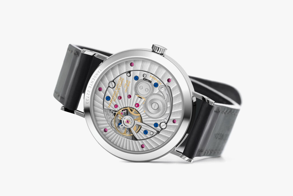 Typisch für Tangente sind die schmalen Ziffern mit Serifen. Sie sind auch in der Datumsanzeige auf 6 Uhr zu finden. Die Rillenoberfläche der kleinen Sekunde nennt man Azurage.