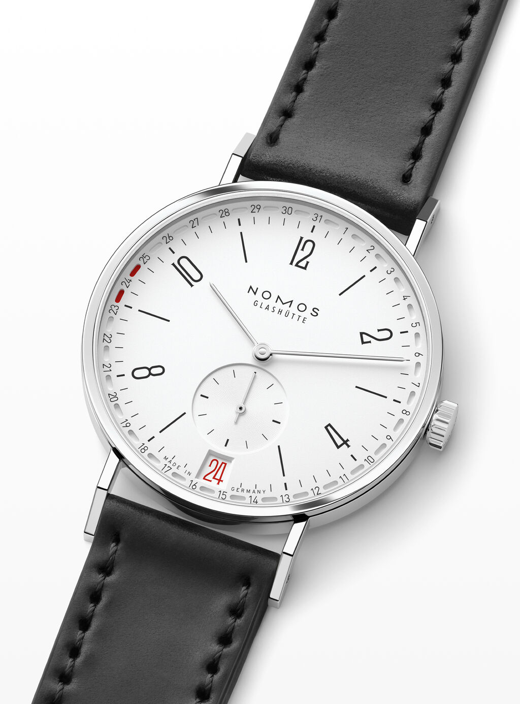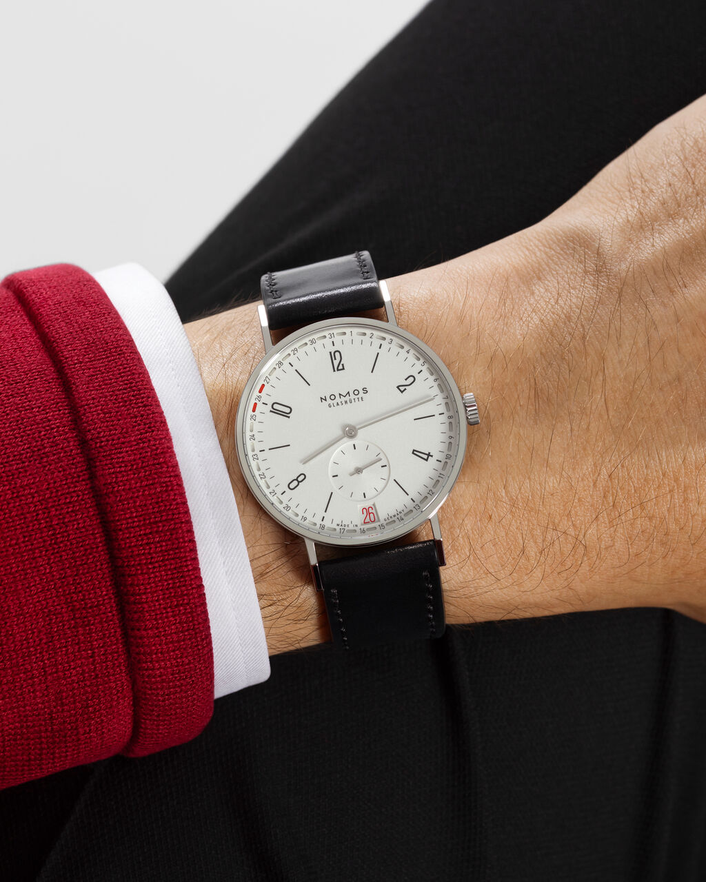 Diese Uhr zeigt, was NOMOS Glashütte ausmacht: Bestehendes wird immer weiter verbessert. Diesmal haben wir unser Handaufzugs-Datumswerk mit einer komfortablen Schnellverstellung ausgestattet. Und es, damit es nicht höher wird als bisher, dabei komplett neu konstruiert. Auf dem Zifferblatt wird das Novum durch eine zweifache Datumsanzeige gefeiert: das umlaufende Ringdatum und ein großzügiges Datumsfenster auf 6 Uhr. Da hat man den aktuellen Tag deutlich vor sich und behält doch den ganzen Monat im Blick. Tangente 2date mit einem Durchmesser von 37,5 Millimetern ist mit weiß versilbertem oder galvanisch blauem Zifferblatt erhältlich.