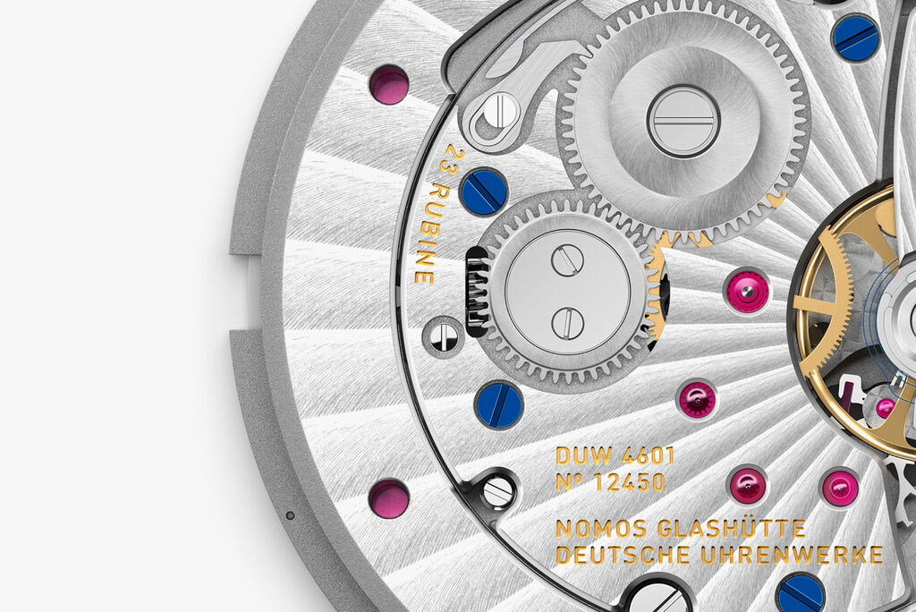 Das exklusive NOMOS-Ringdatum gab es bisher nur in den Update-Varianten von Tangente neomatik und Metro neomatik. Mit dem neuen Kaliber DUW 4601 kann erstmals auch eine Handaufzugsuhr damit ausgestattet werden. Und weil wir gern das Eine tun, ohne Anderes zu lassen, darf die klassische Datumsanzeige auf 6 Uhr weiterhin den Tag betonen, während das Ringdatum für den Monatsüberblick sorgt. Ganz klar: Die Kunst der Gleichzeitigkeit.