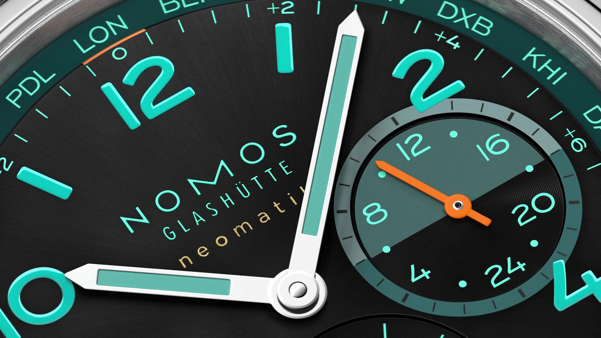 The cool turquoise tones of Club Sport neomatik Worldtimer Trace shimmer like the glass facades of skyscrapers at night.