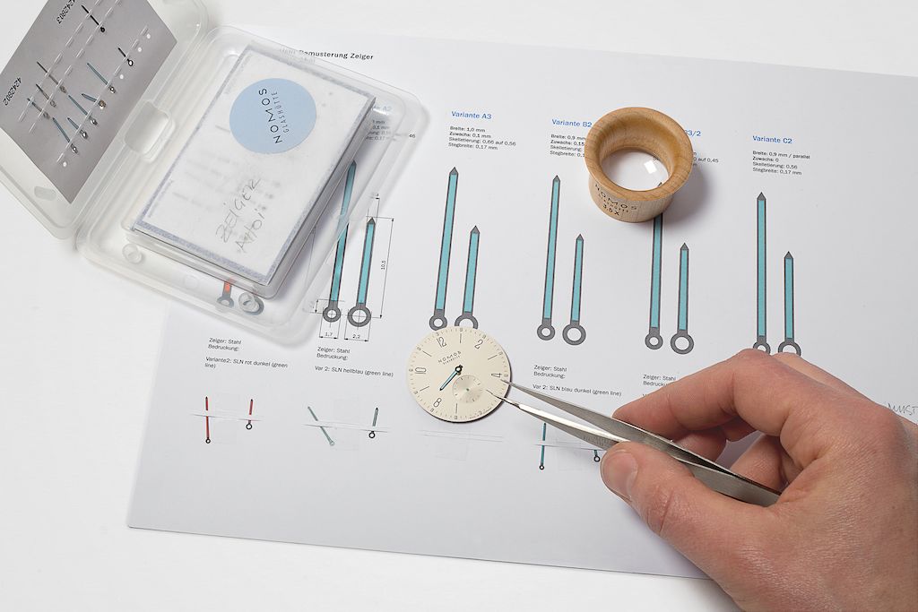 The oldest clock hands could be considered to be the shadow rods of sundials, which were created about 5000 years ago—or rather the shadows of the shadow rods, because only these naturally moved. Watch designs with hands that moved themselves were later developed in medieval Europe, initially only a single-hand models; the minute hand only became necessary as the display became more accurate, which occured in the 18th century. Mechanical watches from NOMOS Glashütte usually have three hands, with the second hand rotating decentrally in the sub-seconds dial. NOMOS watch models without a seconds hand are called Duo.
