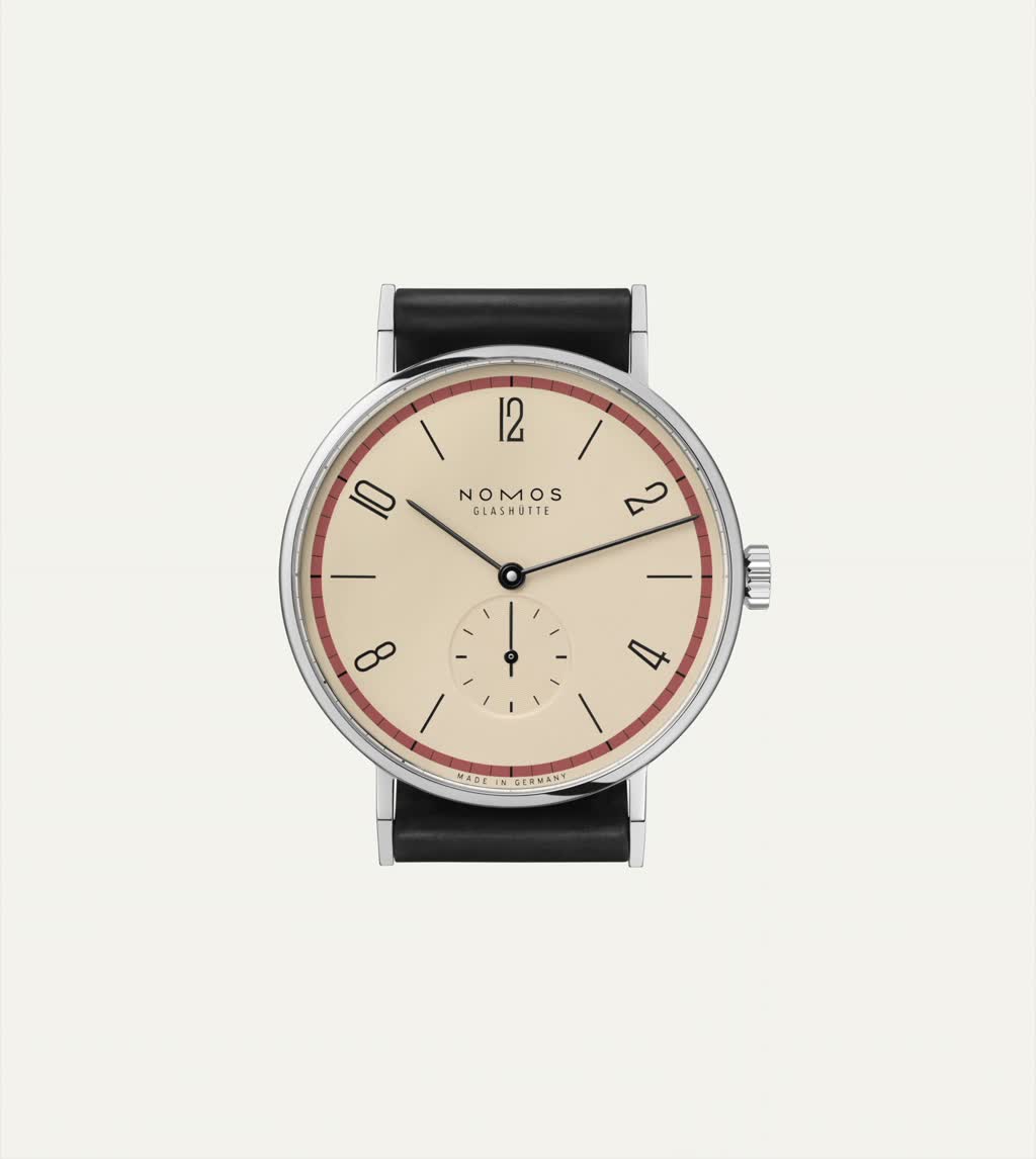 There are three sizes: 33, 35, or 38 millimeters. The hands of all the Tangente models trace a circle of blue, yellow, or red on a background the color of sketch paper. The NOMOS designers have taken a look at the sketchbooks of the Bauhaus masters and made the basic principle of a watch visible. Namely that time is depicted by a circle. Nothing else.