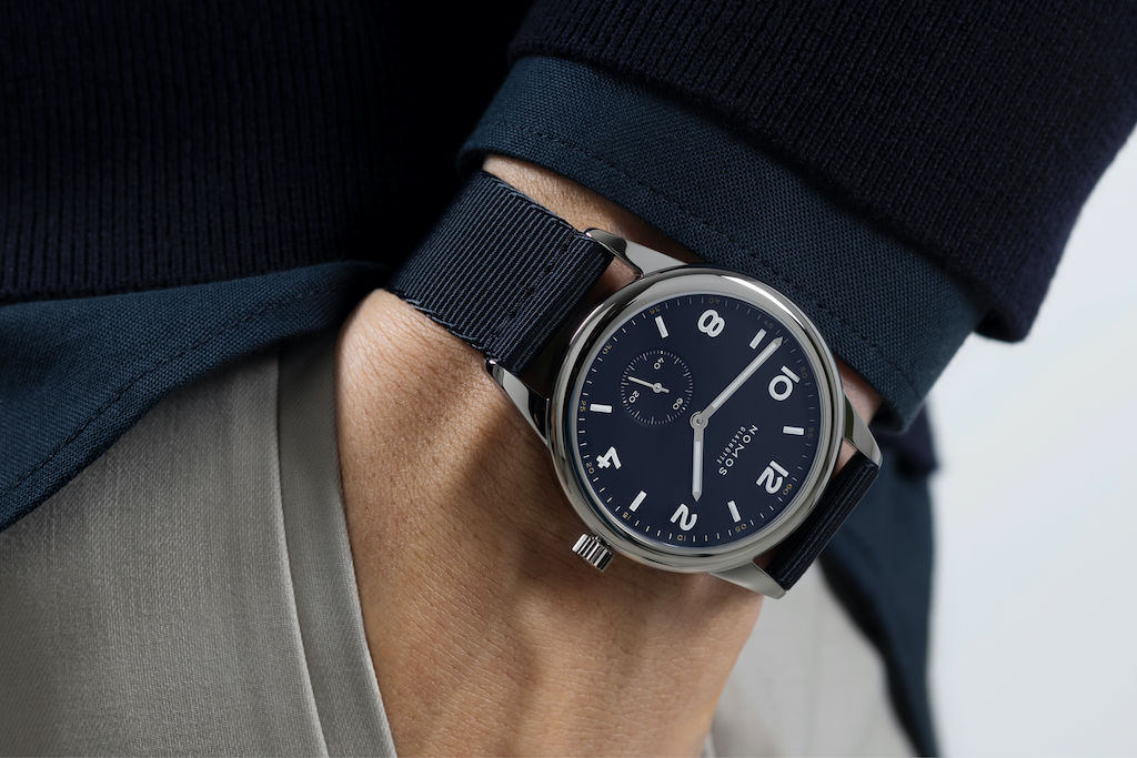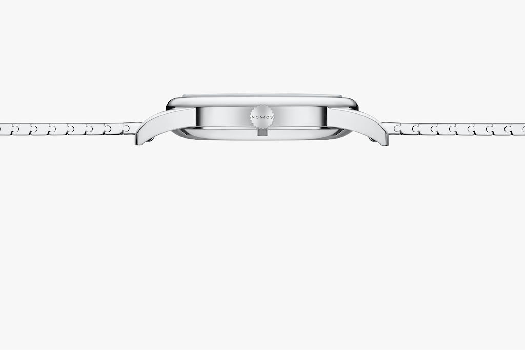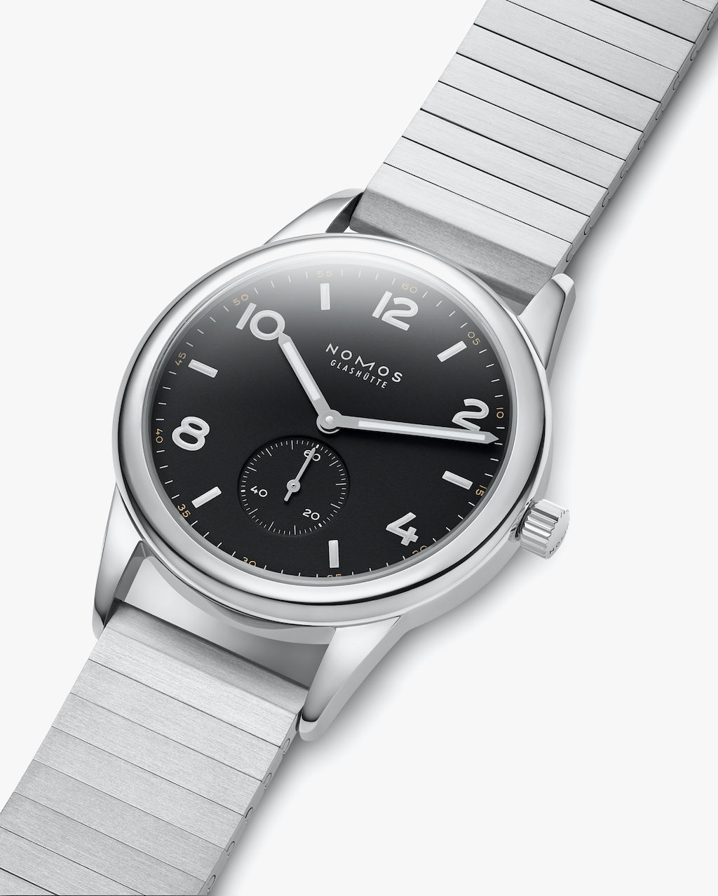The robust stainless steel case, the slightly wider bezel, and the domed sapphire crystal glass make Club automatic onyx a sporty companion throughout the day—and the generously proportioned typography on the black galvanized dial is very legible even at night: Hour numerals, indexes, and hands glow blue in the dark. And the NOMOS Sport bracelet is so exceptionally comfortable you might never want to take it off.
