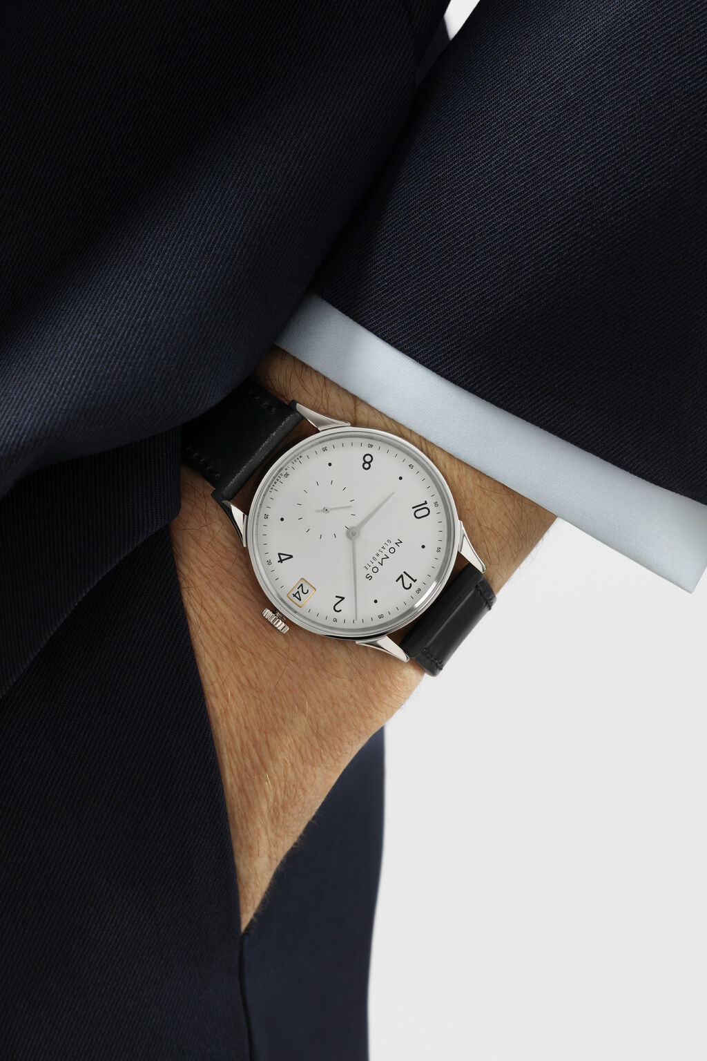 The clear typography used for the hour numerals is distinctly modern, while the date window is located at 3'clock—a classic position that is rarely found in watches from NOMOS Glashütte.