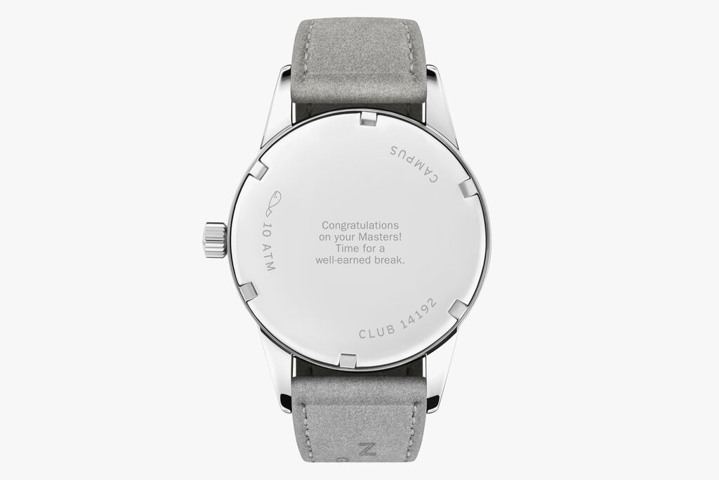 La robusta y juvenil colección Club Campus es especialmente popular entre los clientes de NOMOS como regalo de graduación de la escuela secundaria o la universidad. Cada año se lanzan dos nuevos colores de esfera en dos tamaños, lo que los convierte en la elección perfecta para conmemorar un momento determinado del tiempo. El fondo también ofrece espacio suficiente para grabados personales, incluso en la versión con el fondo de cristal de zafiro.
