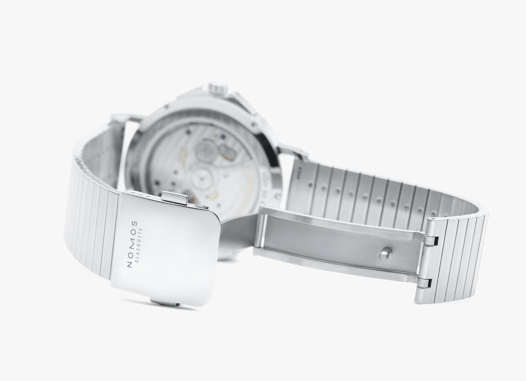 Sometimes we feel bad about how little attention we give it—but not today: it’s the clasp! Visible here are the finely screwed individual parts of the metal bracelet, designed by NOMOS in Glashütte. It consists of 145 parts, made by hand.