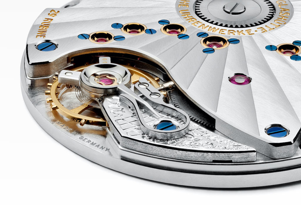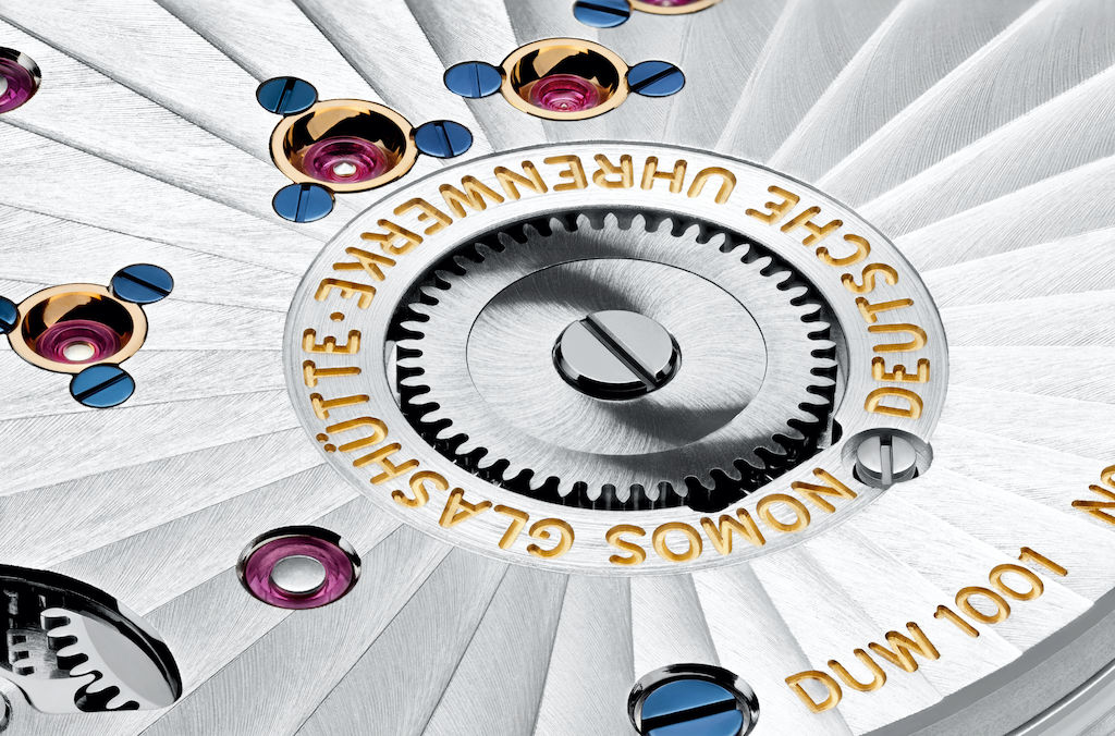 «Realizzato con amore a Glashütte» è l’incisione sul ponte del bilanciere che caratterizza il calibro di manifattura DUW 1001. L’esclusiva complicazione di questo movimento – resa possibile dalla presenza del doppio bariletto - è l’indicatore riserva di carica di 84 ore, straordinariamente preciso.