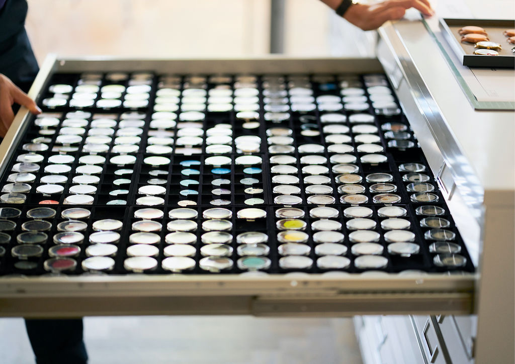 文字盤は腕時計の顔。機械式腕時計では、コーティングした金属-時には貴金属-を使うのが普通で、装飾的なポリッシュ仕上げもよく見かけます。文字盤が伝える情報は、印字や分割が何もないもの(ミニマルウォッチ)から12時間のバリエーションで分表示のあるものやないもの、そしていくつもの分割(スモールセコンドダイヤル)やその他の複雑機構による表示まで、モデル同様さまざまです。通常、ノモスの腕時計にはスモールセコンドダイヤルがあります。複雑機構を搭載したモデルは、さまざまな形式で日付、パワーリザーブ、セカンドタイムゾーン、ワールドタイムなどを表示し、特許取得済の技術もあります。