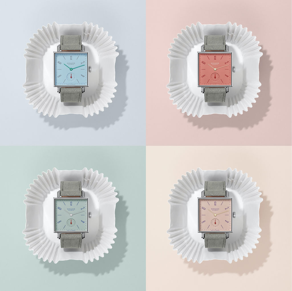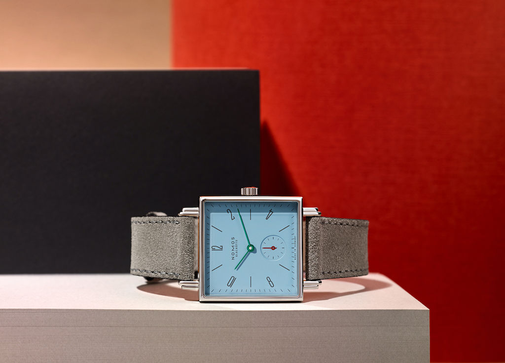 With its square-shaped case, Tetra may appear slightly more austere than other NOMOS models—but perhaps this is why the NOMOS designers love to add a splash of color to the dial as a playful contrast. Alongside the classic version with a white silver-plated dial, Tetra also comes in champagne gold, azure blue, or, most recently, rich plum. These colors transform each Tetra model into an eye-catching work of art for the wrist—as our Tetra Gallery shows: