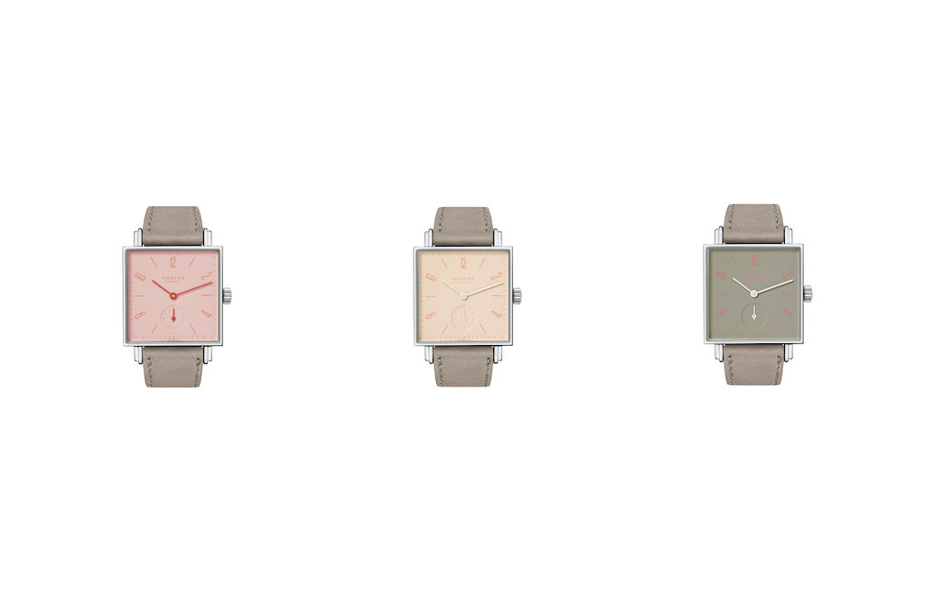 In 2007, NOMOS Glashütte presented sixteen Tetra models at once—in carefully selected tones reminiscent of Bauhaus. Each color harmonized perfectly with the rest, much in the same way that the architect Le Corbusier combined his colors. The Tetra² models are all named after flowers. Here: Tetra Busy Lizzy, Tetra Common Centaury, and Tetra Marsh Thistle.
