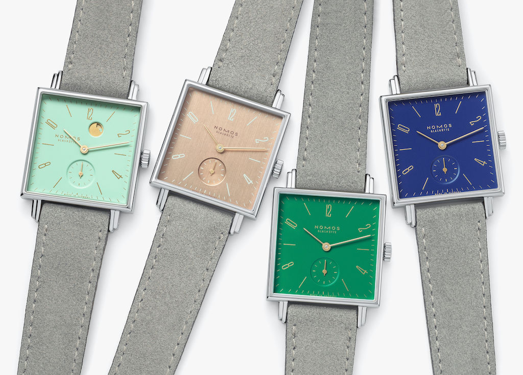 Kleene and Goldelse, Clärchen and Nachtijall: In 2014, four new versions of the square NOMOS classic arrived, with names taken from various aspects of Berlin culture.* This collection features square dials in a bold turquoise, enticing gold, billiard table green, and elegant midnight blue.