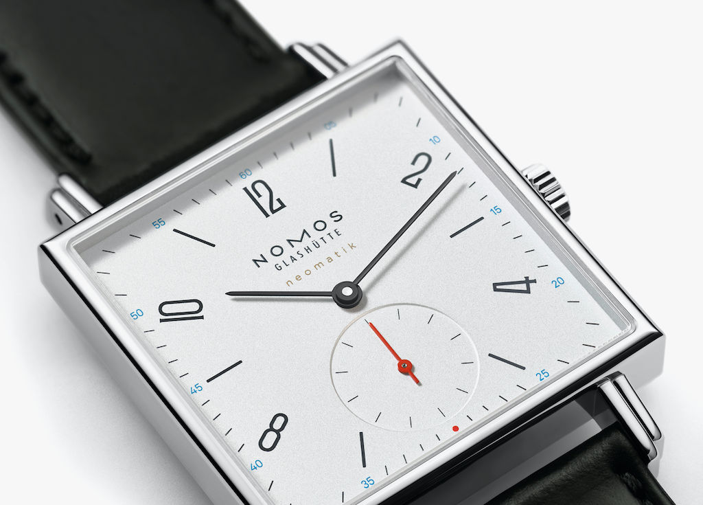 As a member of the Deutscher Werkbund—“German Association of Craftsmen,” a precursory movement to the Bauhaus—the square is often colorful at NOMOS Glashütte too. But it is never simply just red. The watchmaking company has created its own idiosyncratic homage to the square with the Tetra model. Besides the modern typography and delicate lugs, one of the most characteristic features of this watch is its square case: Like the movement of the hands around the dial, most watches are round—but there are also shape watches, which deviate from the “usual” circular form. And aside from the gold model Lux, Tetra is the only shape watch in the NOMOS collection. Straightforward and angular with an edge (or four), Tetra is the answer to the ancient problem of squaring the circle.