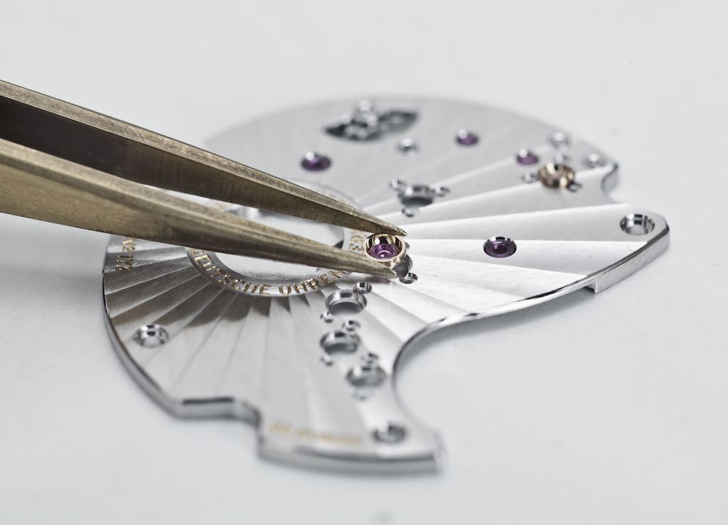 「ラックス」と「ラムダ」は、このモデル専用のアトリエで製作されます。チラネジ付きテンプ、ハンドエングレービングを施したテンプ受け、精緻なゴールドシャントン、手作業で面取りしたエッジ、ツインバレル等を備え、巻き上げは1週間に2度だけというロングパワーリザーブを実現しています。