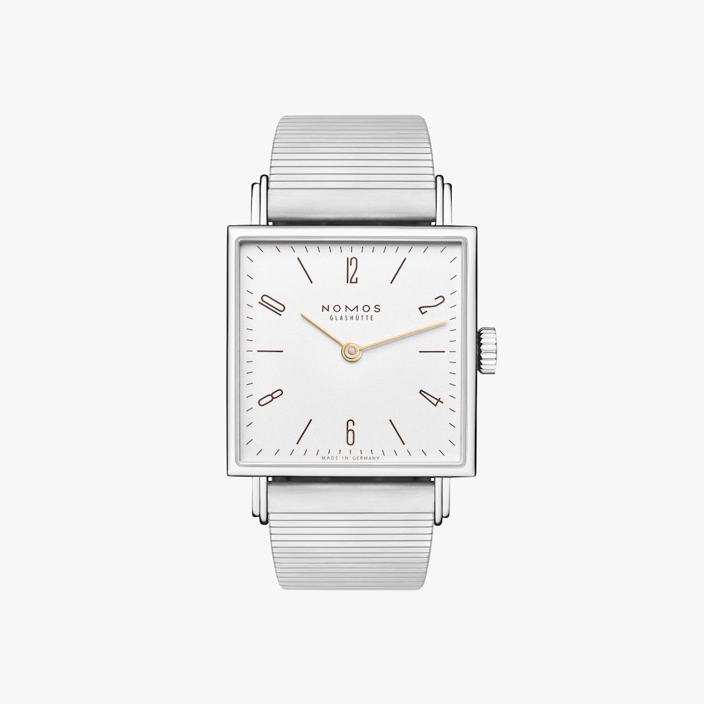 ノモス グラスヒュッテから新登場:デュオ。この秒針のないエレガントなモデルは、直径33mm。こちらのテトラ27デュオの場合は、一辺の長さが27mmです。より細い手首に美しくフィット。秒針なしの高精度な腕時計です。ノモスのキャリバー、アルファ.2を搭載しています。