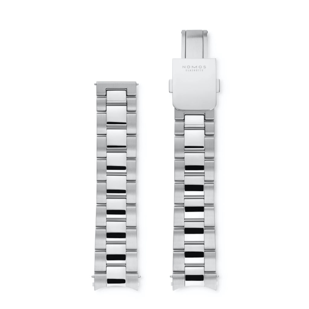具备快速更换功能的精钢表链是以无缝衔接方式与表身和谐地连接为一体。外排的缎面及中排的抛光表节皆可单独移除或添加。此款NOMOS表链仅搭配Club Sport neomatik 42 date black和Club Sport neomatik 42 date blue表款贩售。