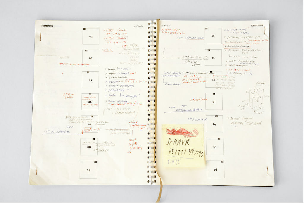 Days of the week organized vertically on the page: “hierarchically”—usually following the intensity of the week, with a busy start at the top and a quieter end at the bottom. Page horizontally divided by the day squares: Often with work-related events on the left and private on the right—noteworthy information is recorded in the squares (e.g. birthdays). The days are not marked with the hours of the day—“neither lines nor numbers”—which corresponds to my everyday life and way of working.