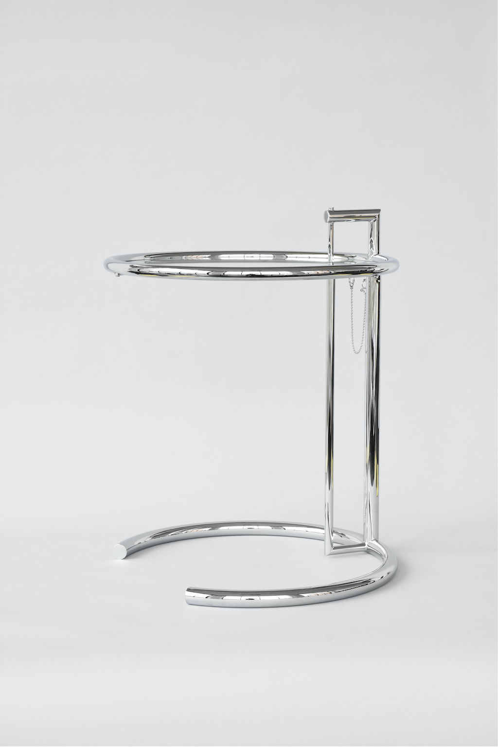 The handle is 22 mm thick and 105 mm long; the table is 510 mm in diameter with 22-mm thick metal edge. The 28-mm thick tubular base has a 315 mm gap. There are eight choices of heights, each 45 mm apart ... by adjusting a tiny metal bar on a chain, the table can be as low as 610 mm and as high as 1010 mm, which is a comfortable height to use while standing. Common sense with a unique personal taste. This is Eileen Gray.